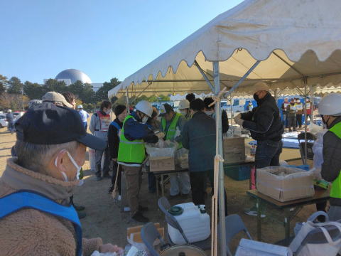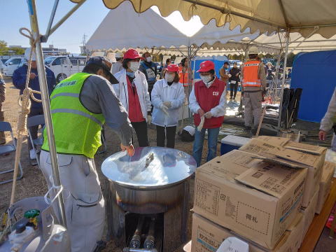 災害ボランティアの協力を得て炊き出し訓練を展開し、会場全員に弁当